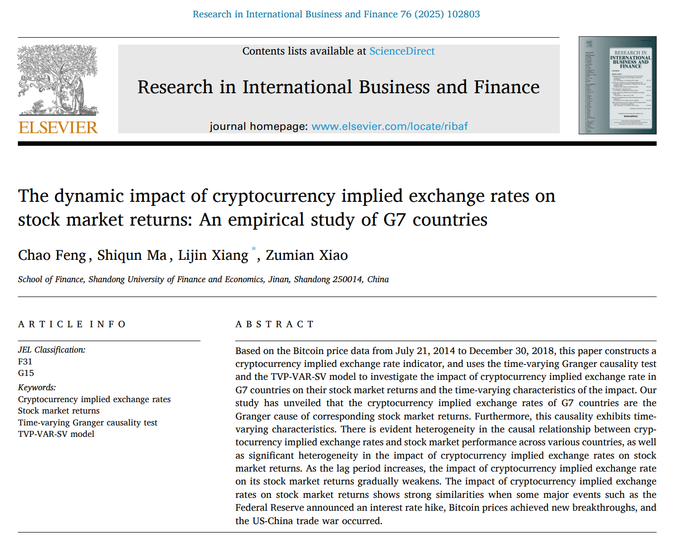 向丽锦副教授作为通讯作者的论文《The dynamic impact of cryptocurrency implied exchange rates on stock market returns: An empirical study of G7 countries》在SSCI一区期刊《Research in International Business and Finance》在线发表。